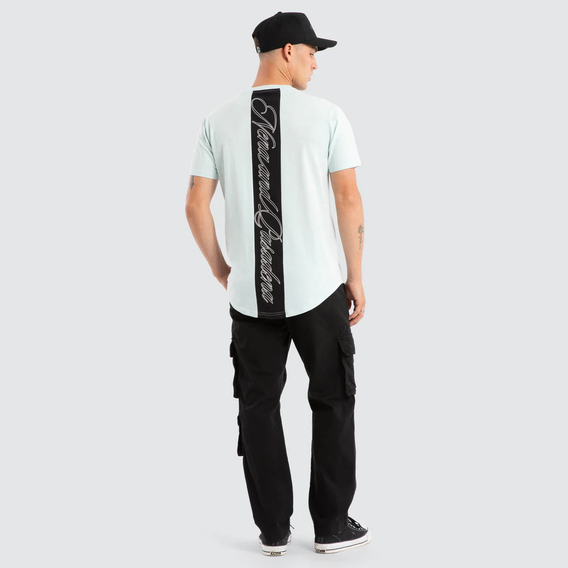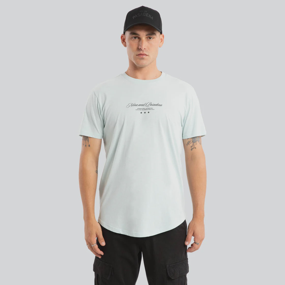 The Juncture Dual Curved Tee in Pastel Blue from NXP offers a slim fit with a unique long length and curved hem. This piece is crafted from a blend of recycled cotton and enzyme silicon soft wash.