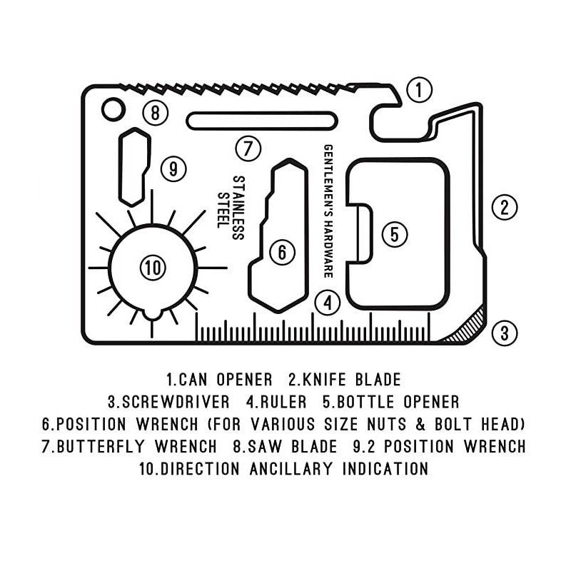 - Includes: can opener, knife blade, screwdriver, ruler, 2 position wrenches, bottle opener, butterfly wrench, saw blade and direction ancillary indication.