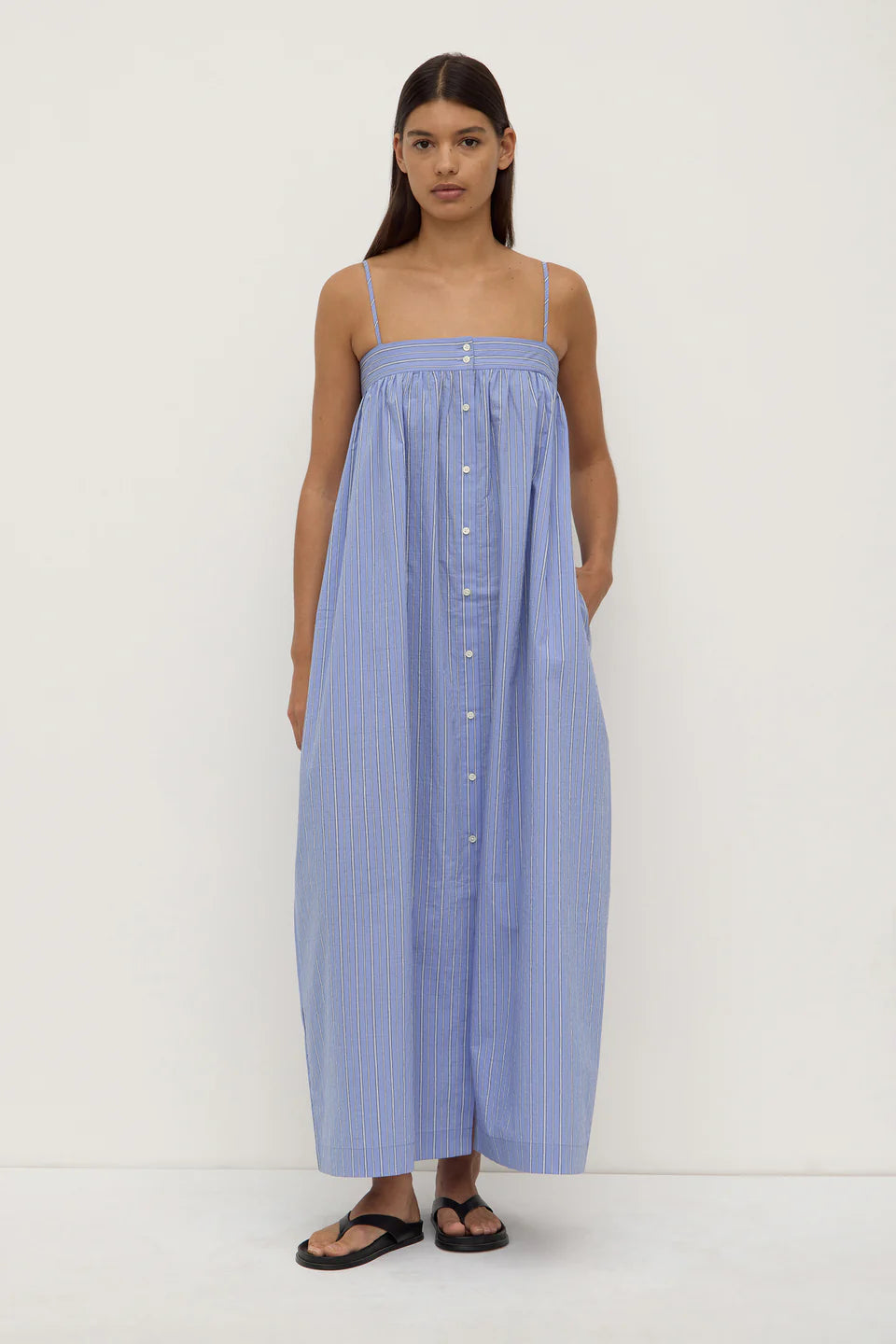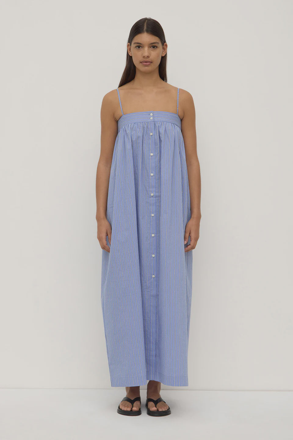 The Erina Stripe Maxi Dress in blue/white stripe features a button-down front, adjustable straps, and is crafted from a cotton blend fabric.